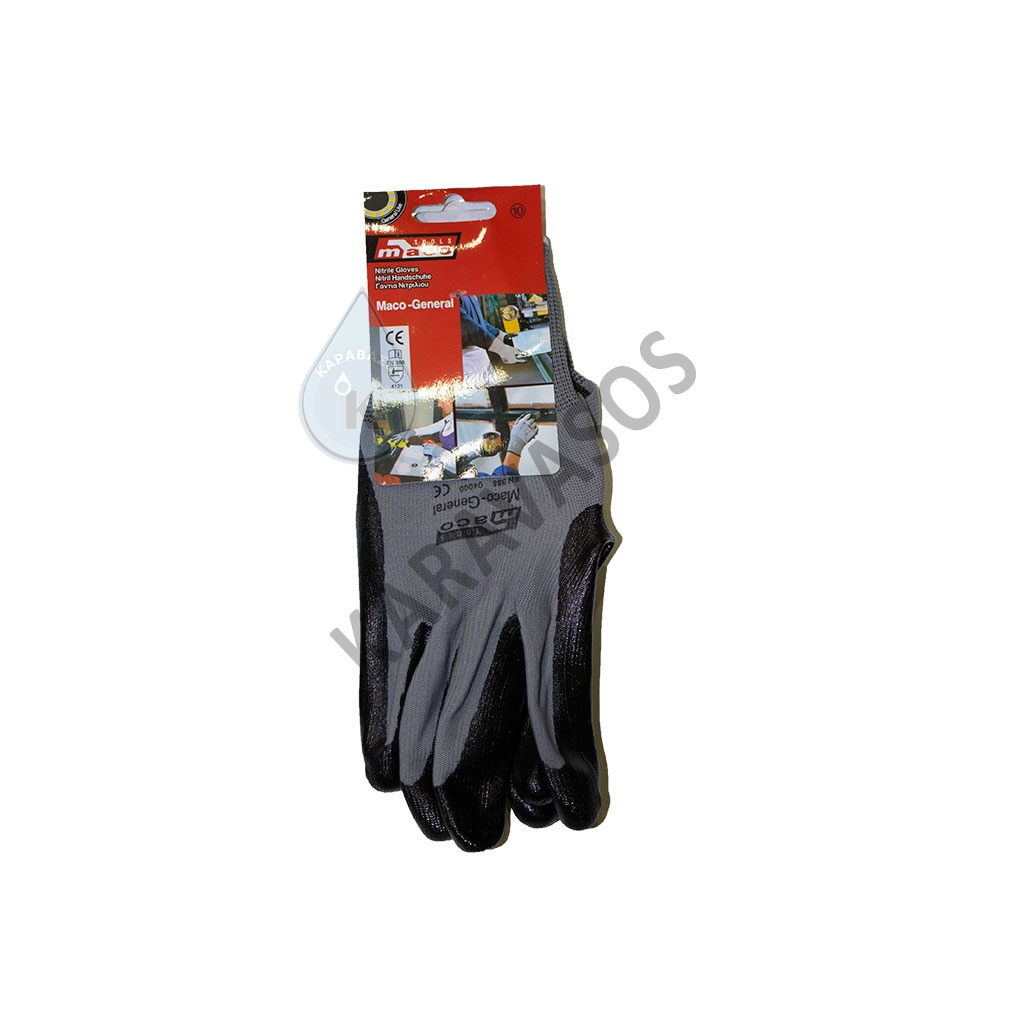 Γάντια νάυλον με επικάλυψη νιτριλίου. Η παλάμη νιτριλίου είναι ανθεκτική σε κοψίματα από μαχαίρι, γυαλί. Κατάλληλα για ελαφριές εργασίες.